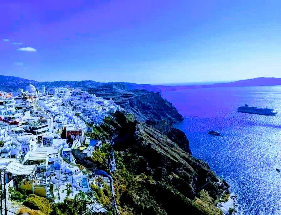 总之,悬崖之上的生命和文明让人惊叹,我思接千载,神游万仞,想起那年坐邮轮去希腊的圣托里尼岛,圣托里尼是希腊最美的海岛。从海上看圣托里尼,光秃秃,灰褐褐的山,寸草不生,那是一座火山,苍茫而寂寞的死火山。在火山之上,有一大片雪白闪耀的房子,它们悬挂在峭壁之上,高低错落、典雅可爱,那就是超凡脱俗的费拉城(Fira ),进了费拉城,可以找到蓝墙白顶的教堂,还可以看这世间最美的日落。游客们从邮轮下了船,可以坐缆车上山,也可以沿着蜿蜒的石阶而上,总共有 588级 梯子。(黄河天梯龙门有365级梯子,象征一年365天)。在公元前3000年,圣托里尼岛就开启了人类文明,公元前九世纪,城市经济繁荣 ,文化昌盛,古希腊人把建筑材料运到火山之顶,在悬崖峭壁上打造石梯,轰轰烈烈建了一座绮丽耀眼的城。