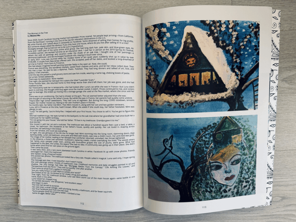 一個人精力有限,運氣有限,我不想耗費大好時光在我不擅長的領域。正當我準備徹底放棄英文寫作之時,轉機意外降臨:一家美術雜誌(Art Journal)選中了我的四幅丙烯畫,皆是樹屋題材。我向主編說明,這些畫其實是為故事而作的插畫,圖文一體、彼此呼應,最好能一同呈現。起初她並不同意,明確強調:我們是藝術雜誌,不刊登文學內容。但最終她還是接受了我的提議。