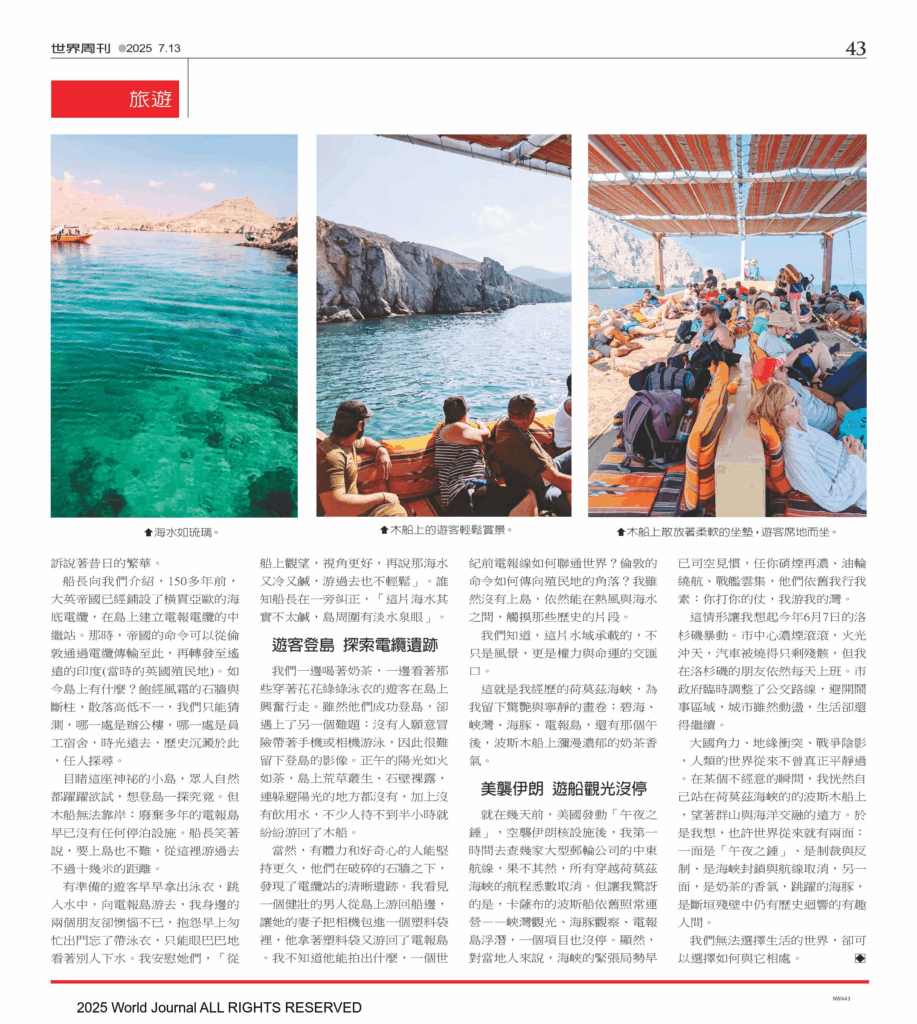 大国角力、地缘冲突、战争阴影,人类的世界从来不曾真正平静过。在某个不经意的瞬间,我恍然自己站在荷莫茲海峽的的波斯木船上,望着群山与海洋交融的远方。于是我想,也许世界从来就有两面:一面是“午夜之锤”、是制裁与反制、是海峡封锁与航线取消,另一面,是奶茶的香气,跳跃的海豚,是断垣残壁中仍有历史回响的有趣人间。